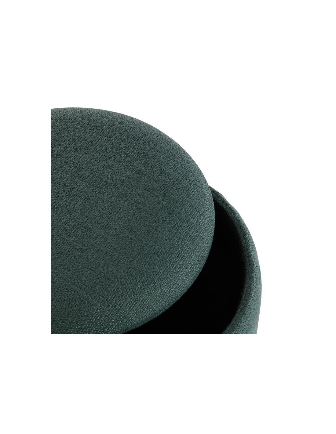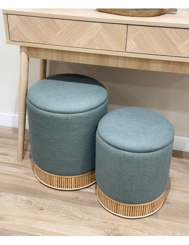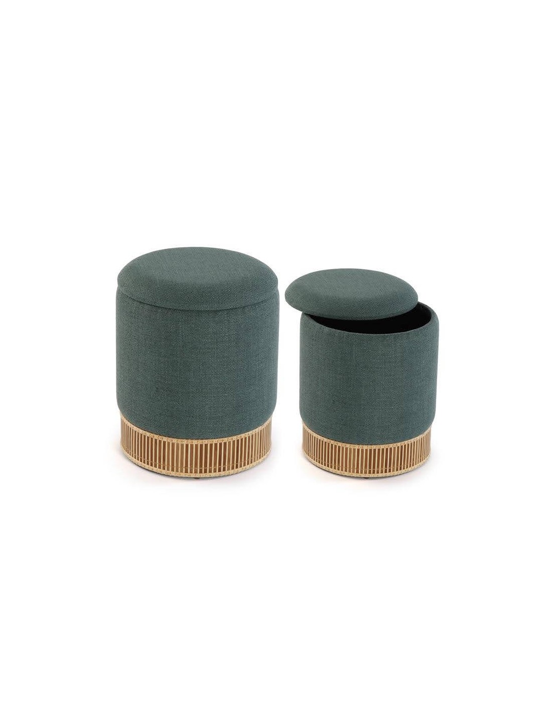 Bonito puff redondo con almacenaje oculto, tapizado en tejido verde y rematado con una base decorativa de bambú.