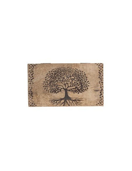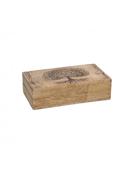 Caja decorativa de madera con tapa tallada con el Árbol de la Vida, perfecta para guardar pequeños objetos con encanto. Su diseño artesanal aporta un aire natural y espiritual, convirtiéndola en un detalle decorativo lleno de simbolismo.