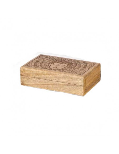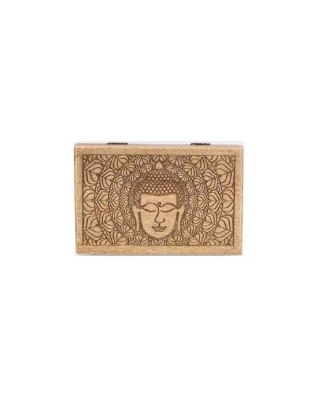 Caja de madera decorada con un bonito grabado de la figura de Buda en la tapa, rodeada de detalles florales.