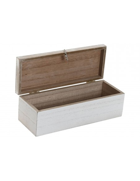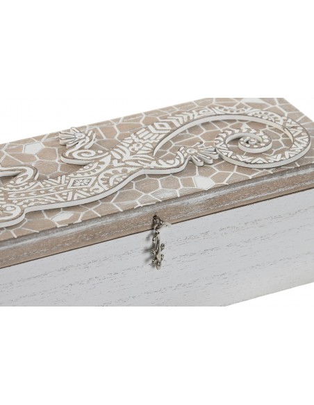 Bonita caja de madera en tonos blanco y natural con tapa decorada en mosaico y figura de lagarto en relieve.