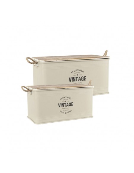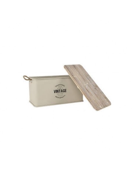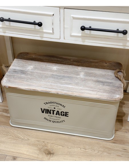Caja metálica en color beige con tapa de madera decapada y asas de cuerda en los laterales.