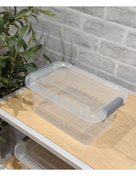 Práctica caja multiusos, su diseño transparente permite ver el contenido de un vistazo y la tapa con cierre de clic asegura que nada se mueva.