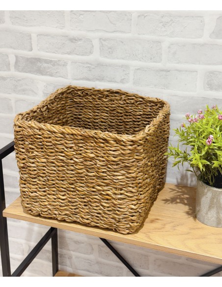 Bonita y práctica cesta de fibras trenzadas, con forma cuadrada y un tono cálido que aporta textura y un aire acogedor a cualquier rincón de casa.
