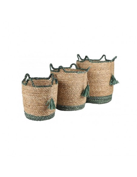 Decorativa, resistente y con un aire natural muy especial. Su diseño en cuerda trenzada con detalles verdes y borlas a juego la convierte en una pieza con mucho encanto.