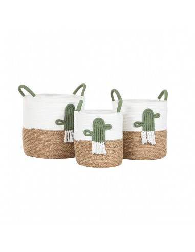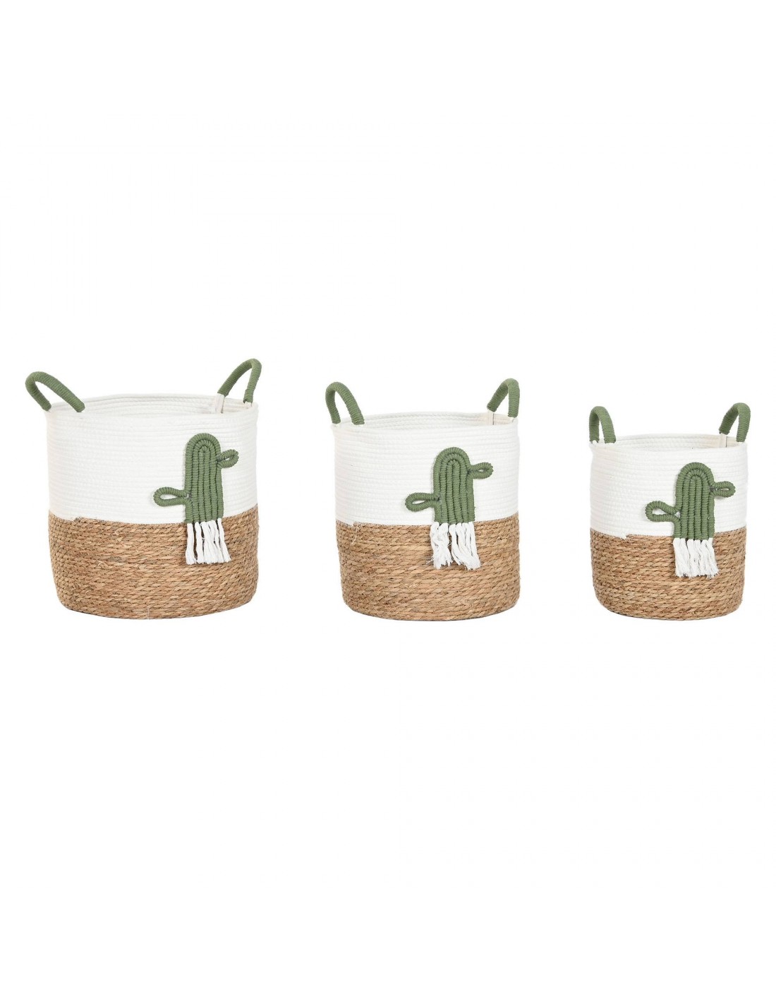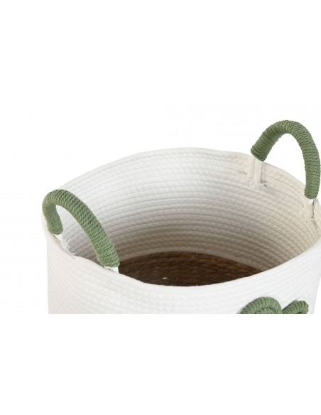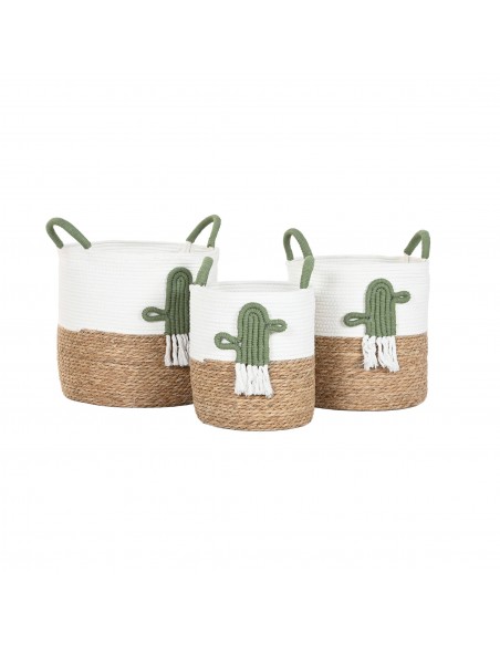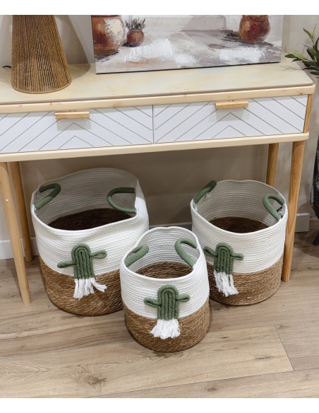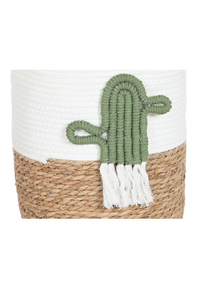 Bonita cesta decorativa fabricada en cuerda de algodón y base trenzada de fibras, adornada con un original cactus de cuerda en relieve.