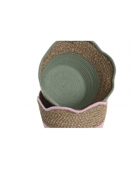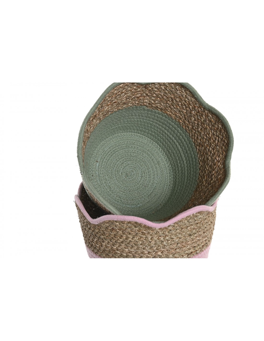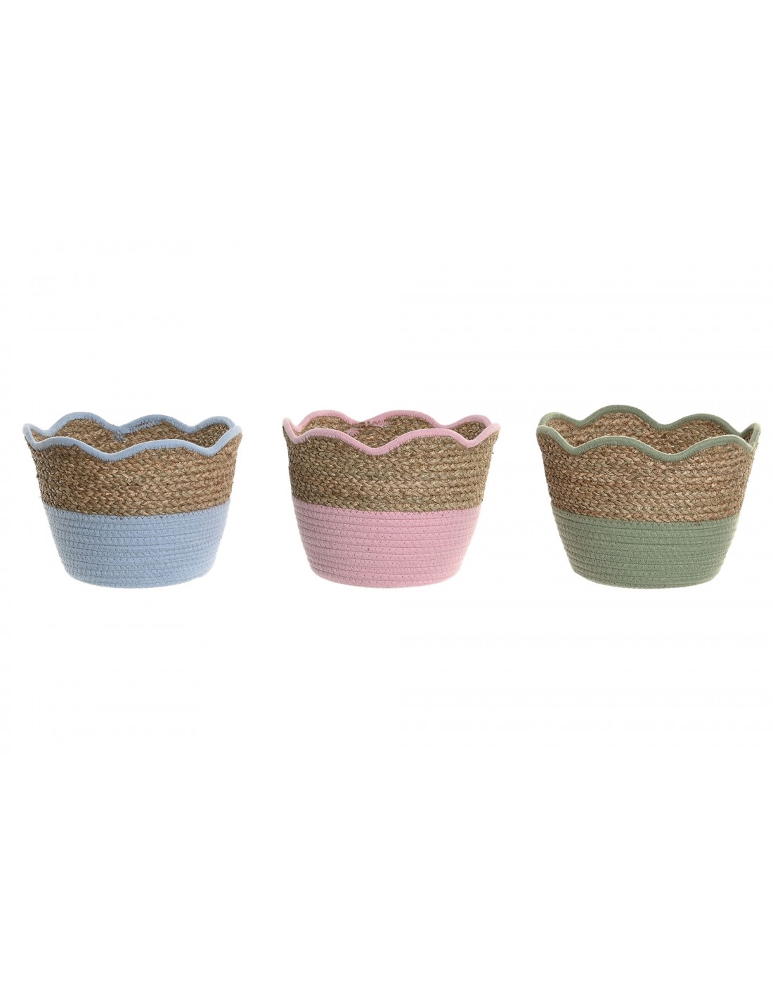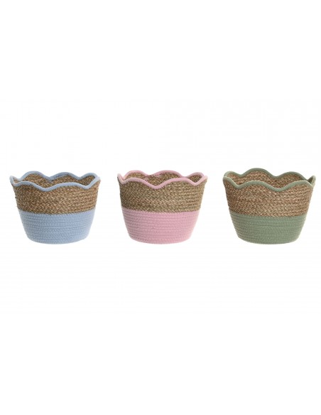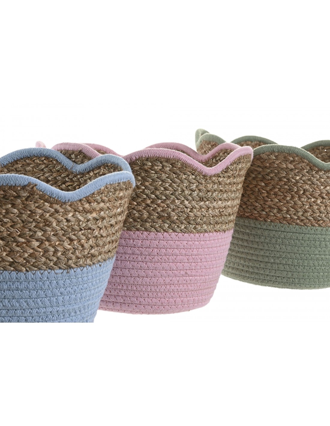 Cesta decorativa de fibra natural con base de algodón trenzado en color y borde superior ondulado a juego.