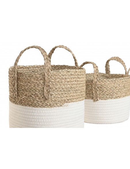 Cesta redonda elaborada en fibras naturales con base blanca de algodón tejida en espiral y cuerpo superior de trenzado rústico.