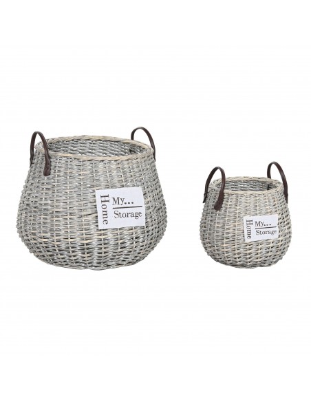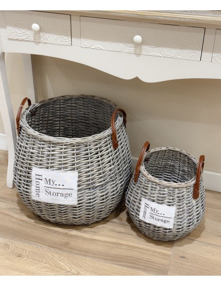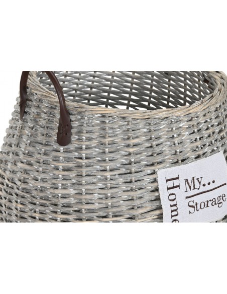 Bonita cesta de almacenaje elaborada en mimbre trenzado con acabado envejecido y detalle frontal en lino con el mensaje “Home My... Storage” bordado.