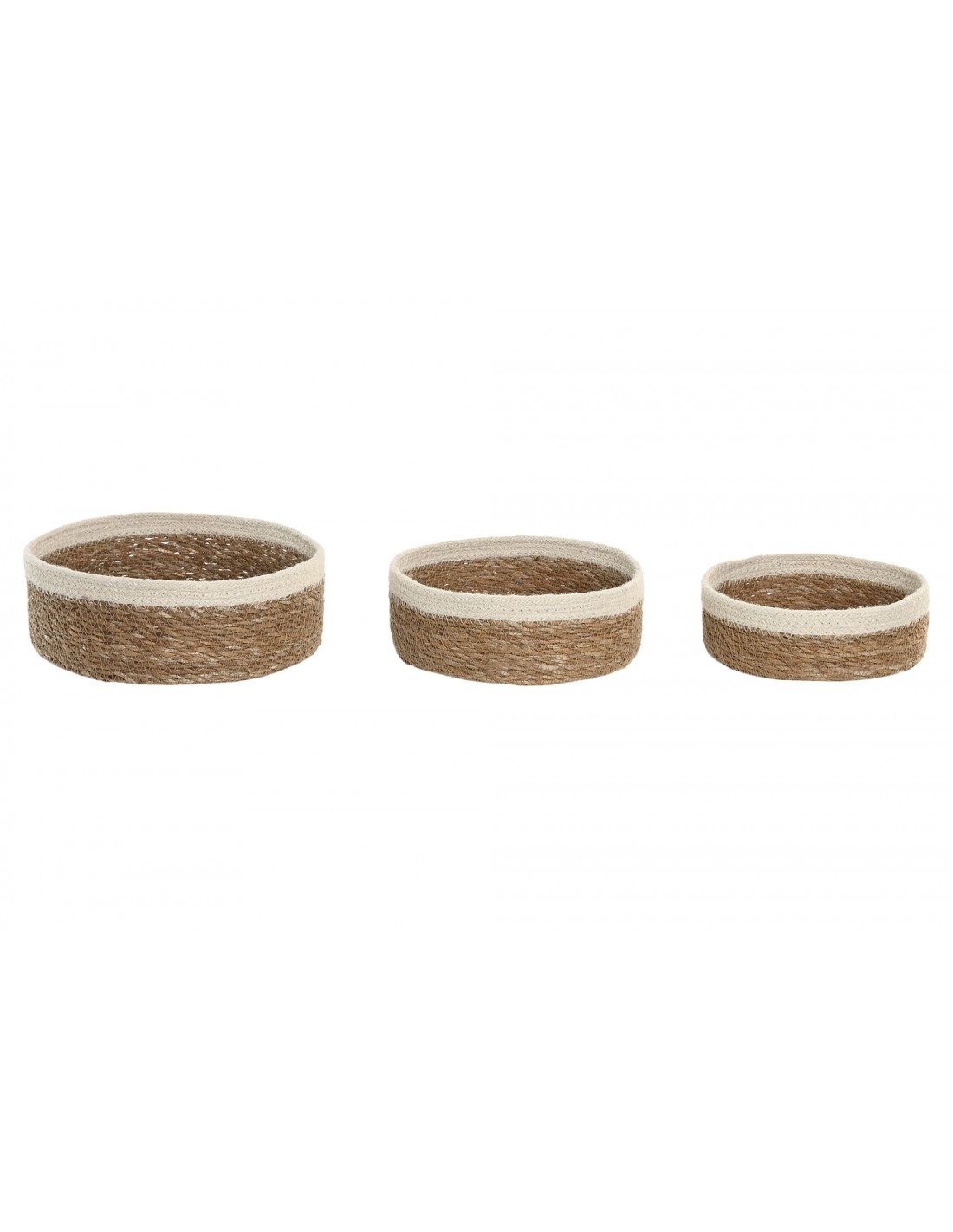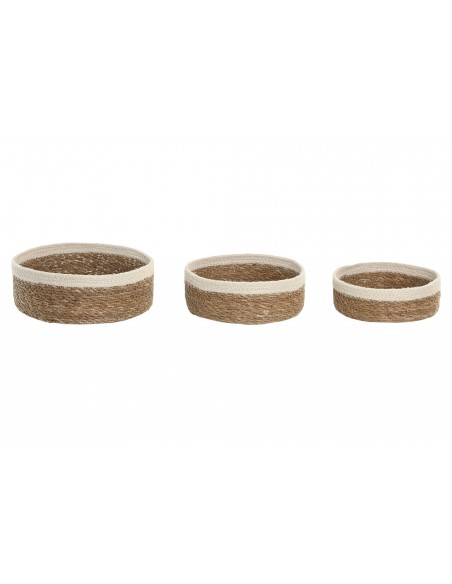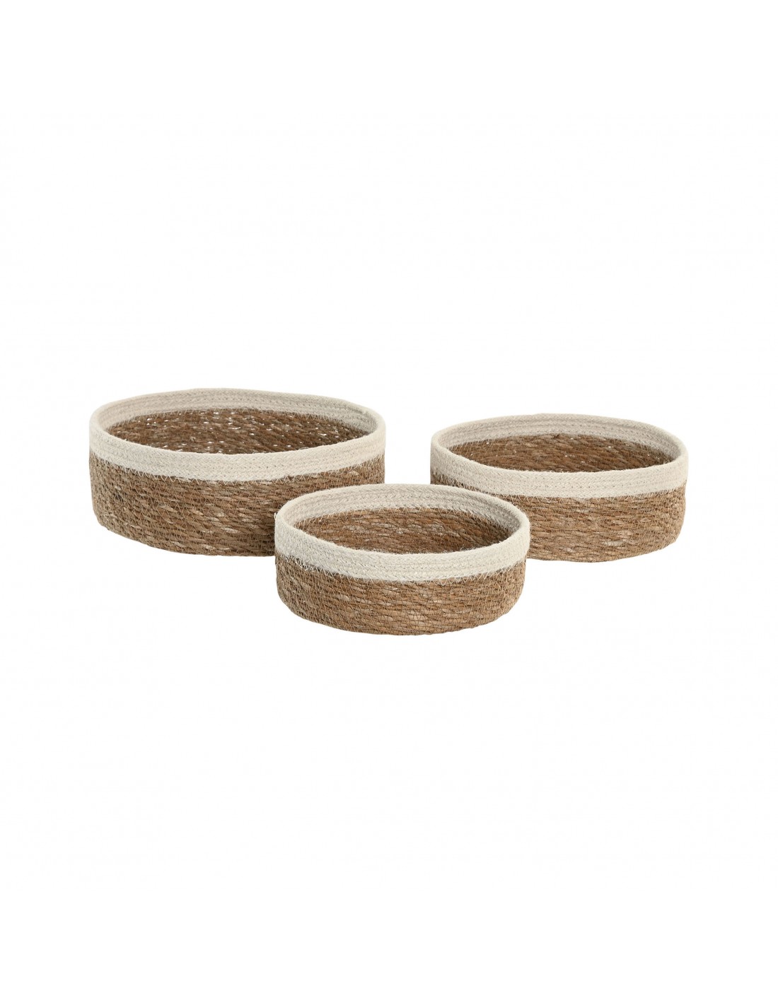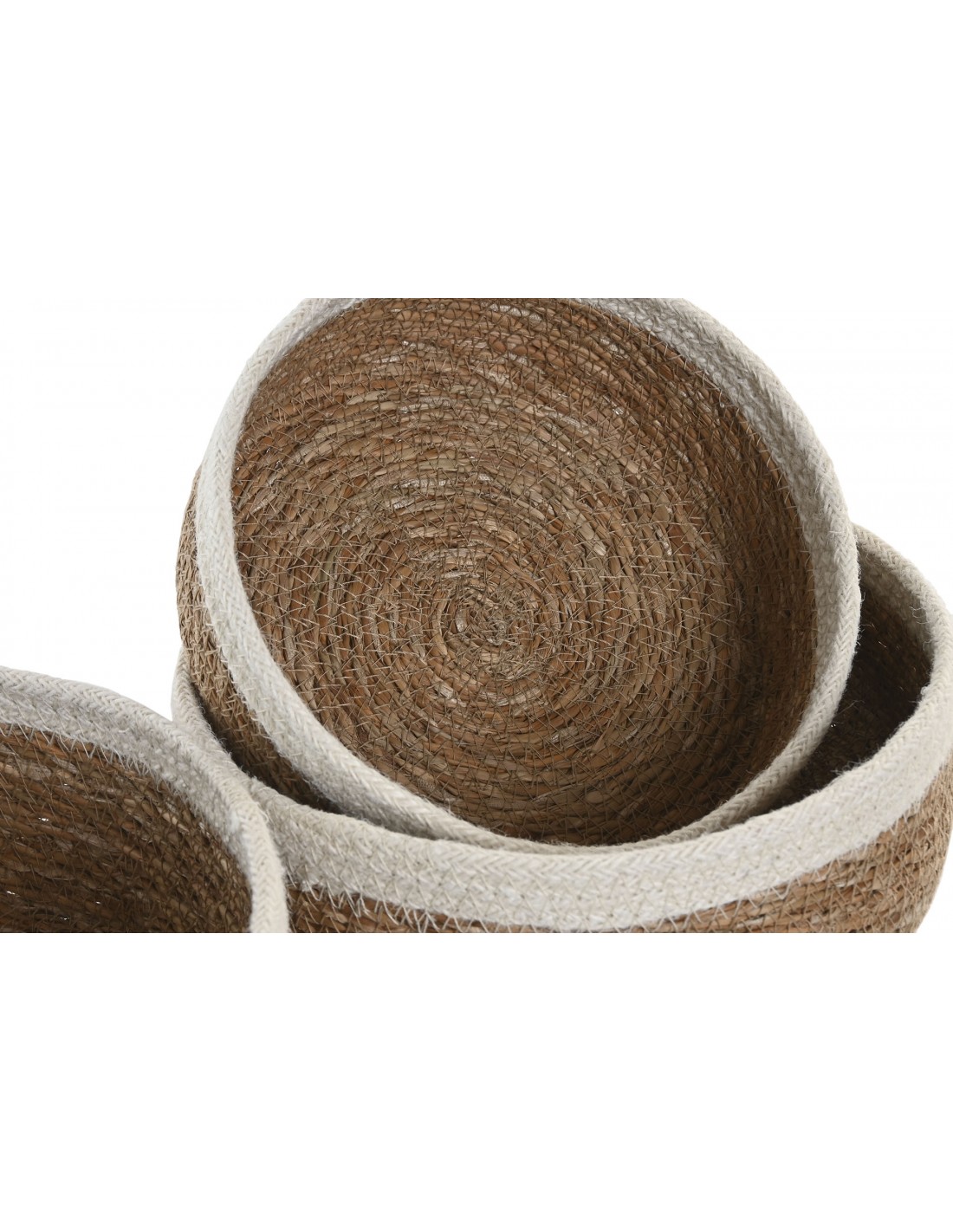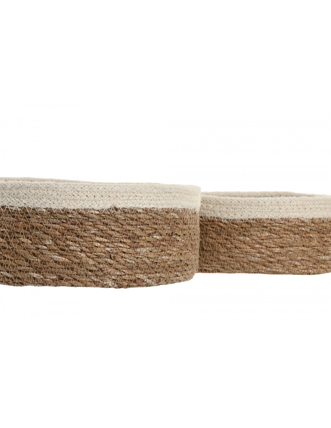 Cesta redonda elaborada en fibra de yute con acabado trenzado y borde superior en algodón crudo.