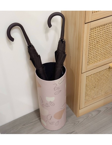 Original paragüero de forma redonda de color rosa palo con un sencillo diseño de figuras abstractas, toque muy elegante para que no desentone con la decoración de tu recibidor. Todo un indispensable para tu hogar.