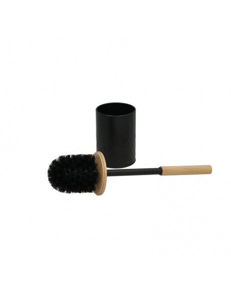 Elegante escobillero de baño con recipiente negro de acabado mate y sutil diseño en relieve, acompañado de un mango de madera que aporta un toque cálido y moderno.