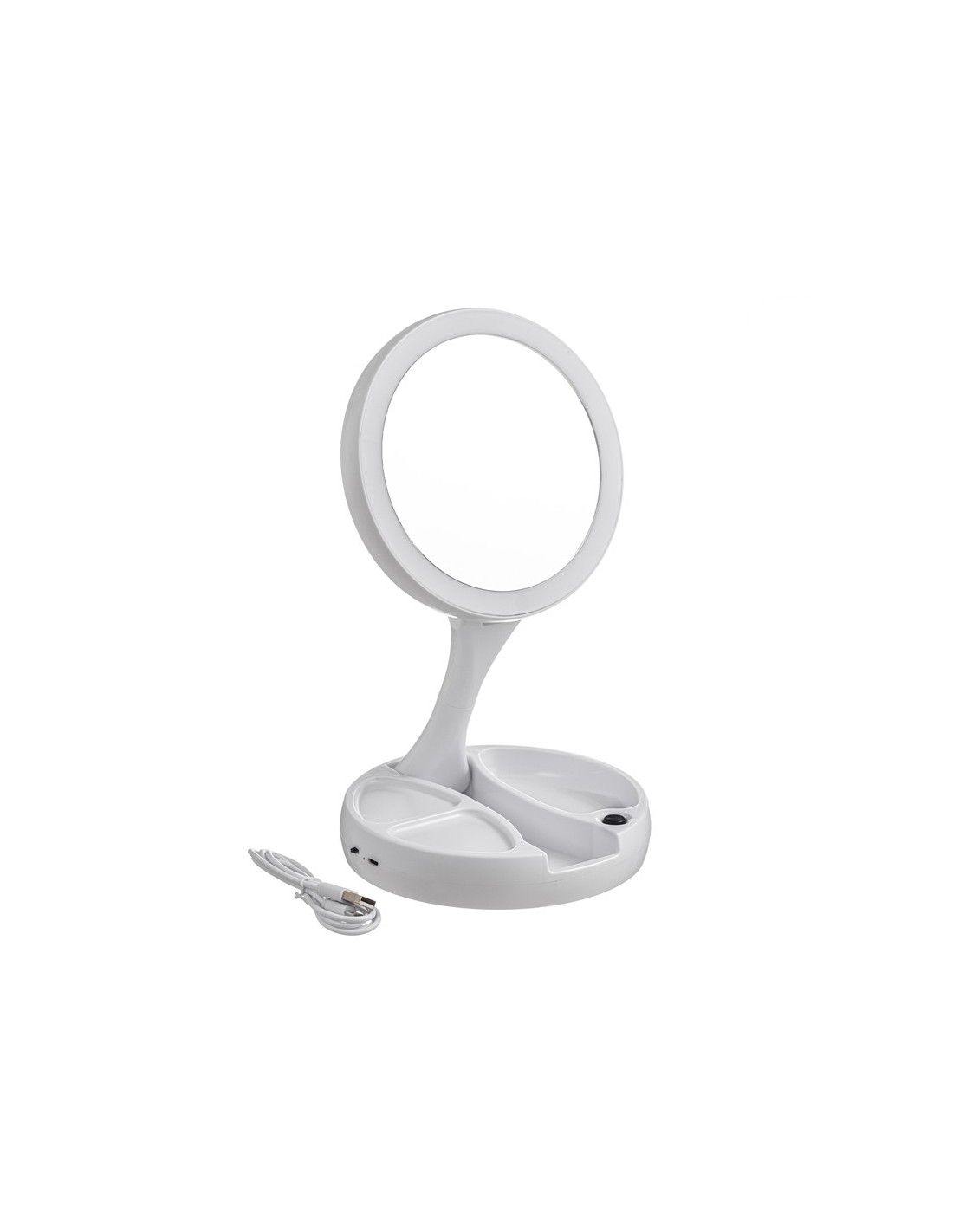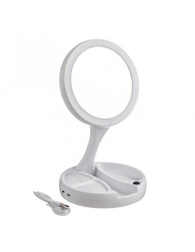 Súper práctico espejo doble, uno normal y otro con 5 de aumento, va sobre una base redonda de PVC blanco con hueco para guardar accesorios y lo mejor de todo es que su pie se dobla y puedes plegar el espejo para que no ocupe espacio.