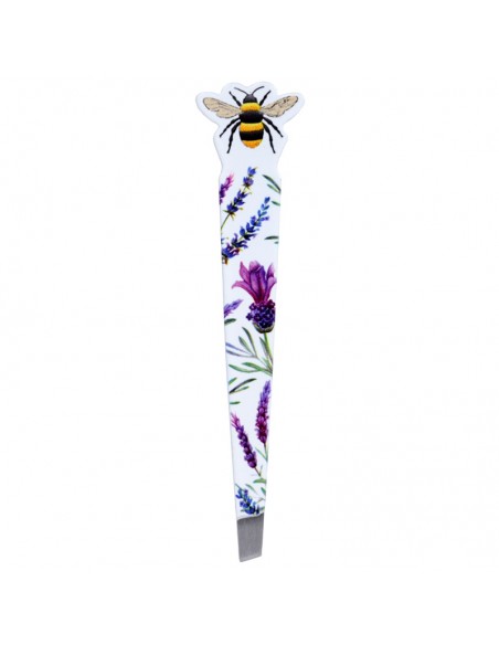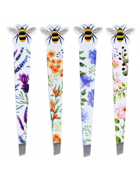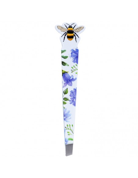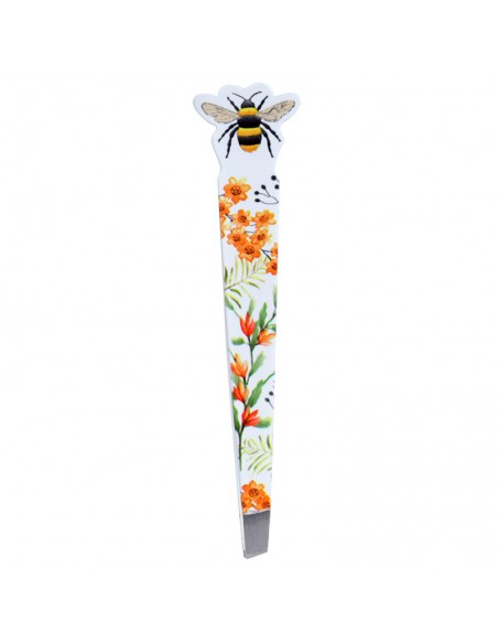 Pinzas para depilar de metal en color blanco con un precioso diseño muy primaveral con un estampado floral y una abeja en la parte superior.