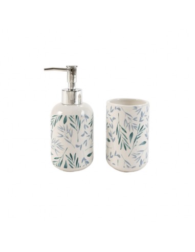 Set de baño en cerámica decorado con delicadas hojas en tonos verdes y azulados sobre fondo blanco.