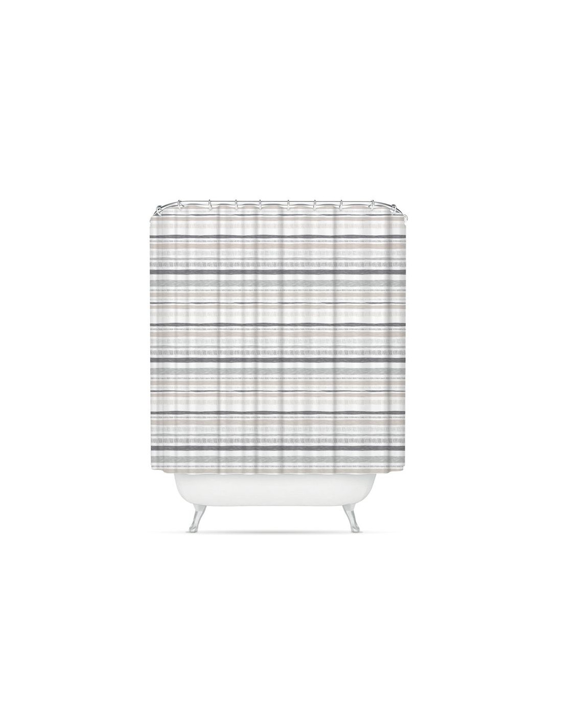 Elegante cortina de baño de poliéster con diseño de rayas horizontales en tonos gris y beige, perfecta para aportar un estilo limpio y moderno al espacio.
