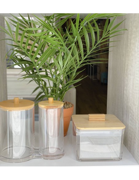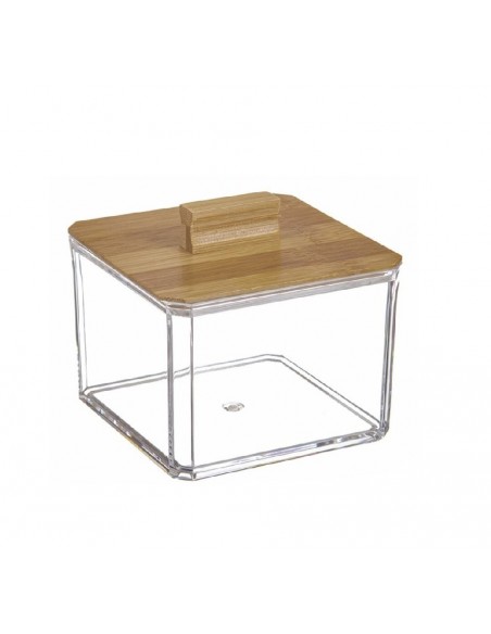 Elegante dispensador cuadrado de metacrilato con tapa de bambú.