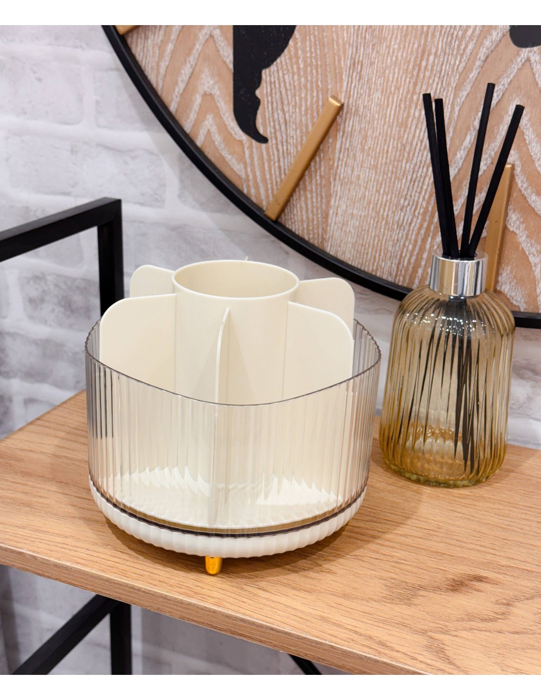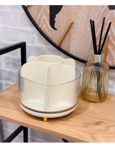 Elegante organizador en tono crema con base transparente acanalada y pequeños pies dorados. Su diseño con compartimentos interiores permite tener todo el maquillaje y brochas bien ordenados y siempre a mano.
