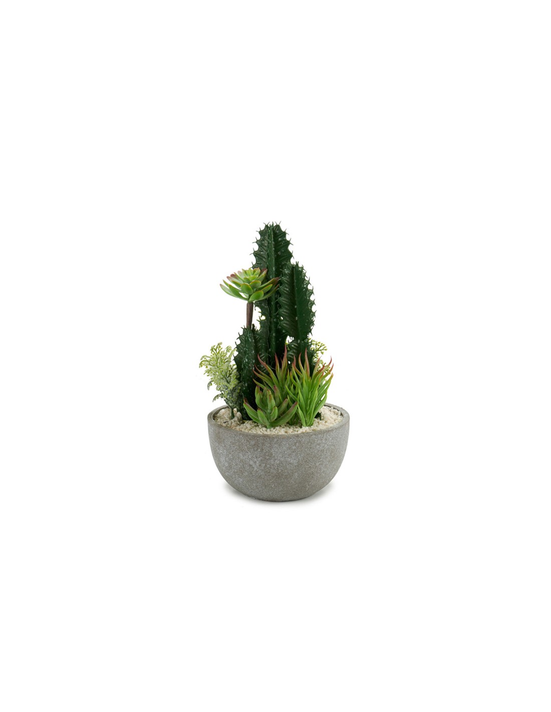 Decorativo centro de suculentas artificiales con cactus, crasas variadas y pequeños detalles verdes, todo presentado en una maceta redonda efecto cemento con base de gravilla clara.