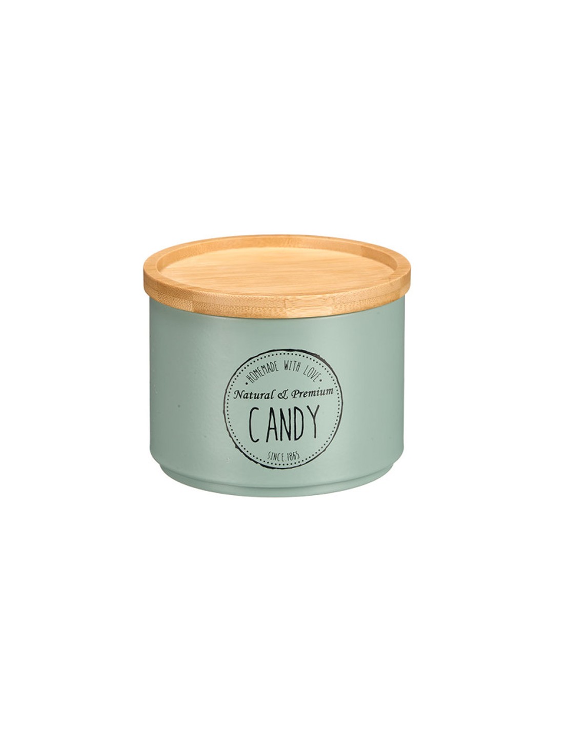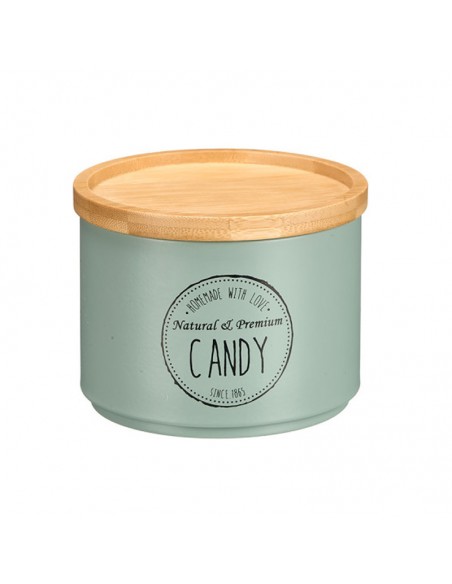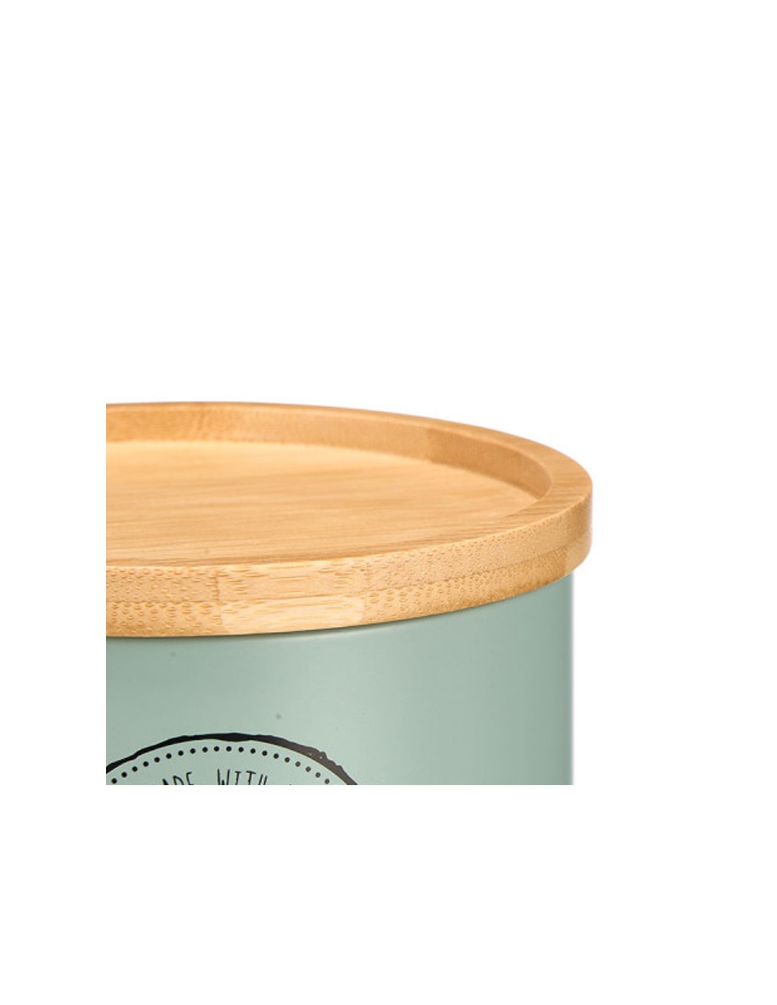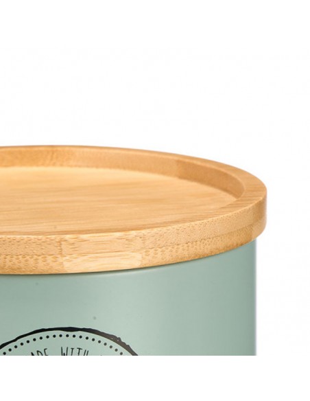 Bonito bote de cocina de estilo retro con cuerpo metálico en acabado mate y tapa de bambú natural con cierre hermético.