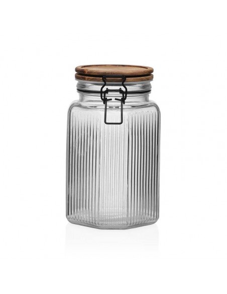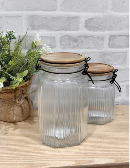 Elegante bote de cristal con relieve vertical, tapa de madera de acacia y cierre metálico en negro que asegura un sellado hermético.