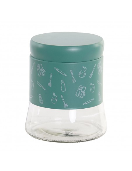 Bote de cristal de 800ml de capacidad, su mitad supeior es de color verde agua con un siseño estampado en blanco de utensilios de cocina además tiene tapa a rosca.