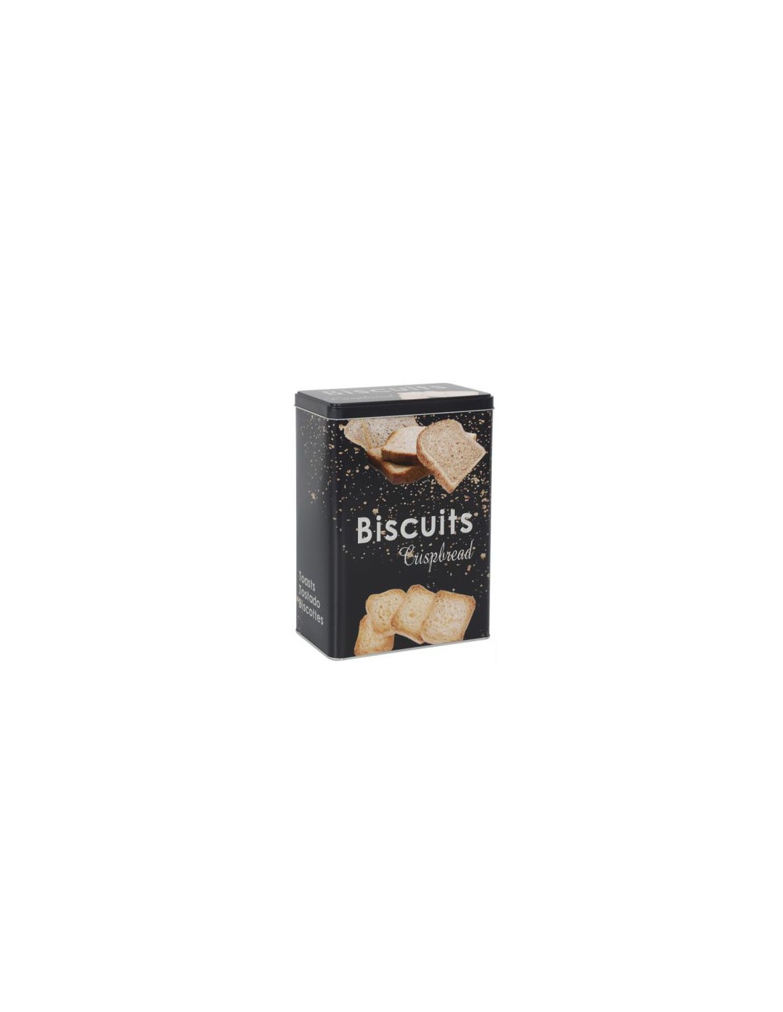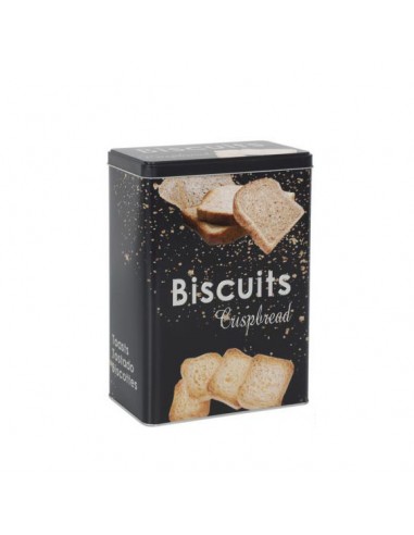 Bote de metal con diseño impreso de tostadas y fondo negro con detalles en dorado, ideal para guardar galletas, biscotes o tostadas.