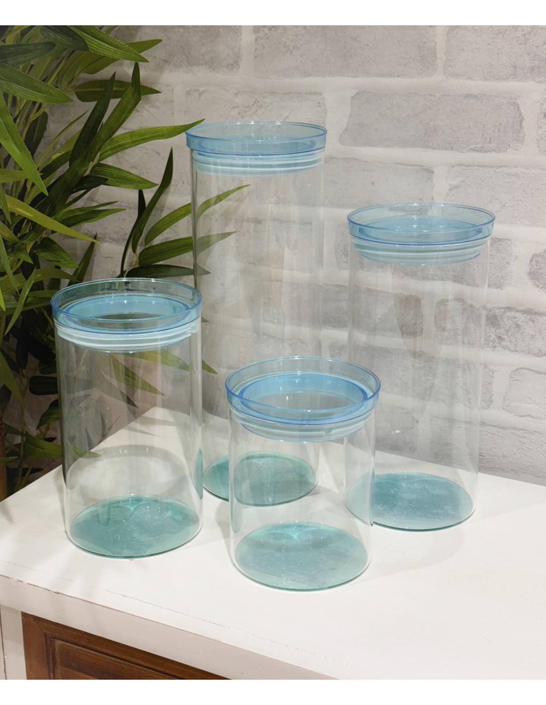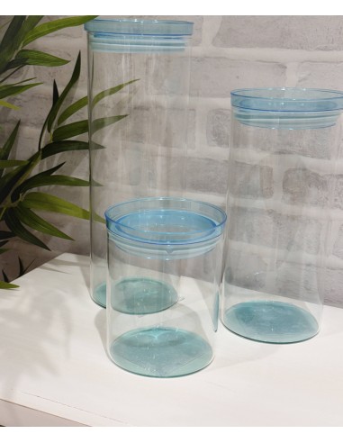 Práctico bote transparente de borosilicato con tapa azul de plástico.