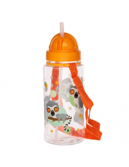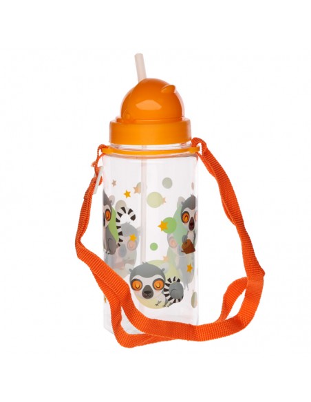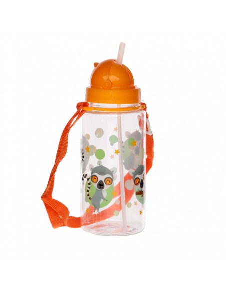 Práctica botella infantil reutilizable de PVC transparente, con su parte superior de color naranja tiene una larga asa para colgarsela cómodamente, trae incorporada una pajita que se guarda gracias a su tapa deslizante