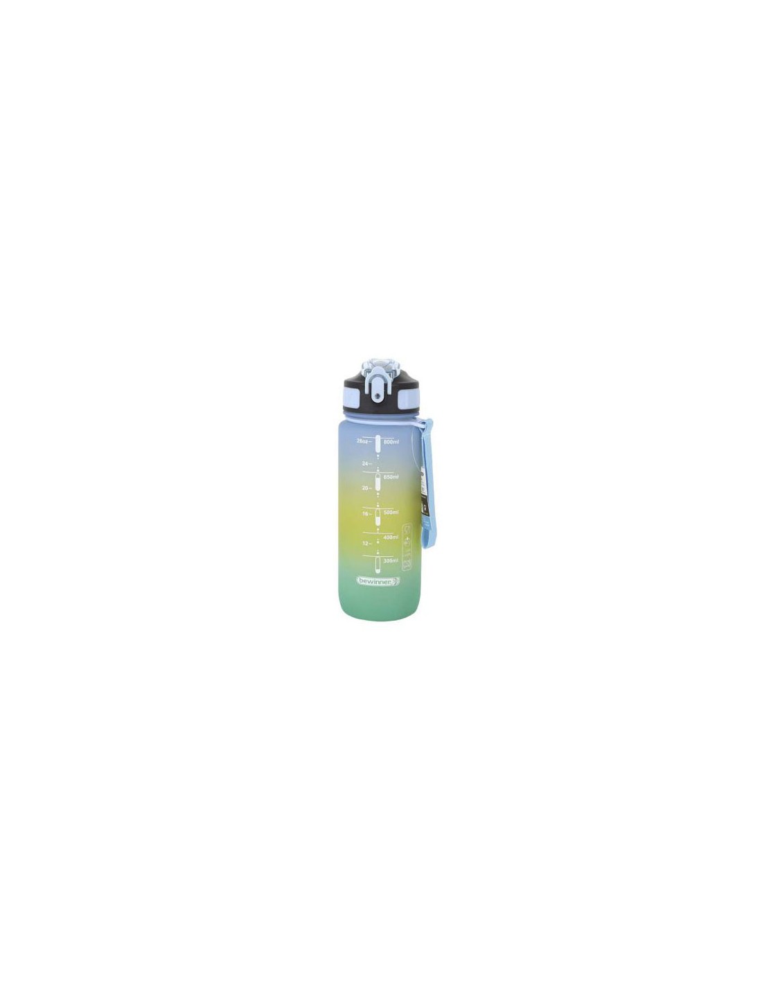 Botella deportiva de 800ml con diseño en degradado azul. Cuenta con escala de cantidades, boquilla con pajita abatible, tapa con cierre de seguridad y correa para llevar cómodamente.