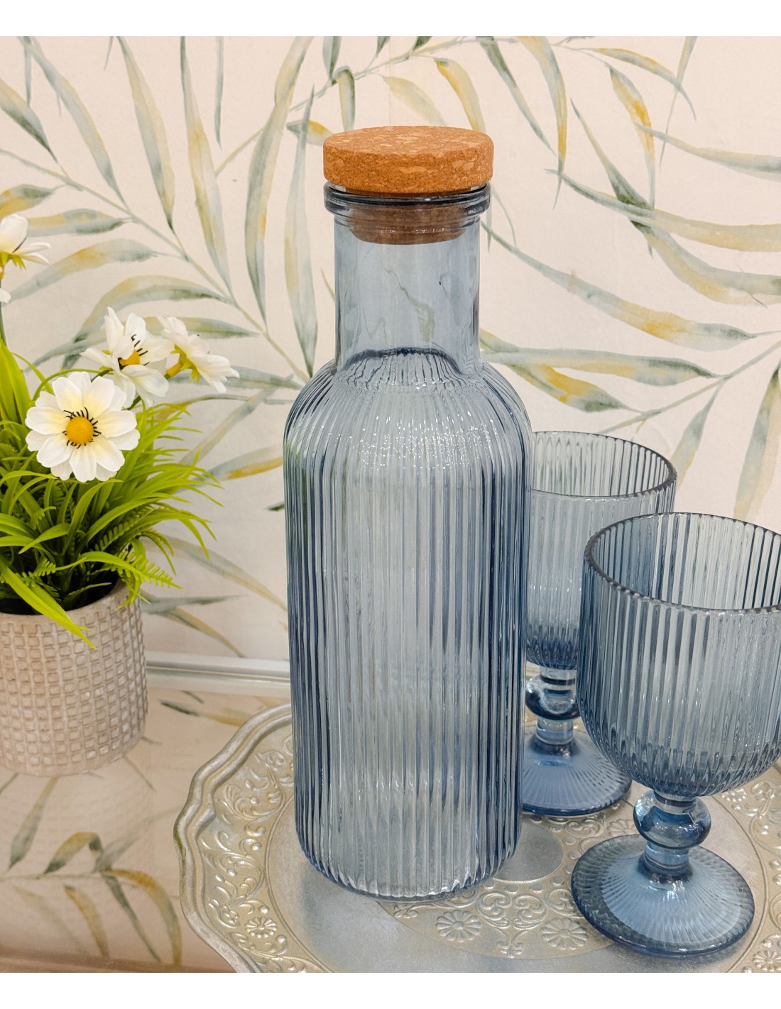Original botella de cristal azul con diseño acanalado y tapón de corcho. Su estilo sencillo y actual la convierte en una pieza práctica y decorativa a la vez.