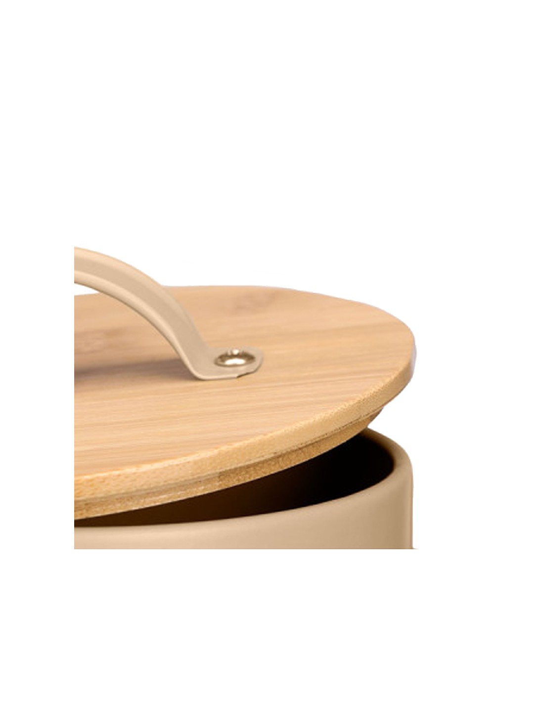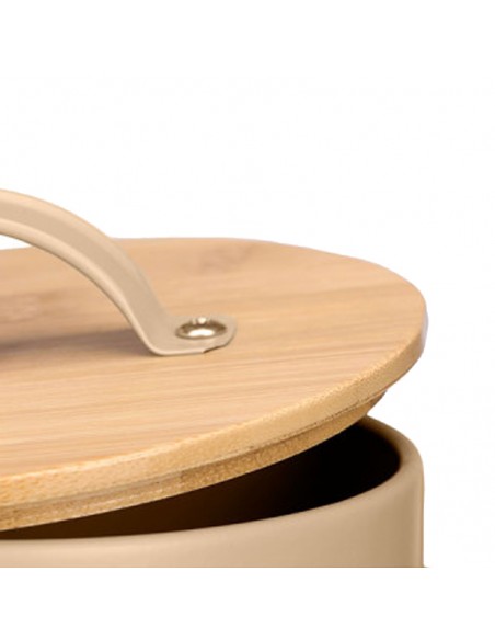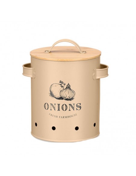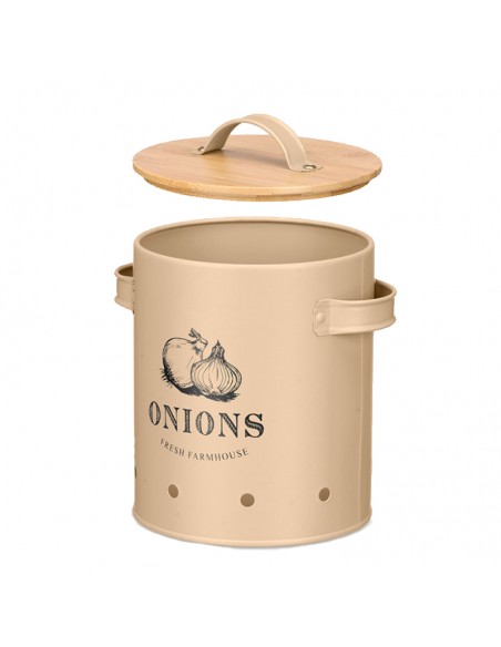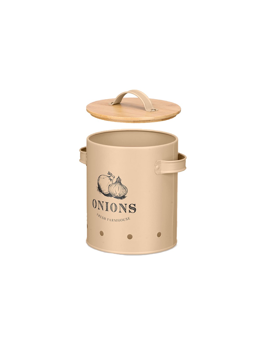 Práctico bote metálico con diseño ilustrado y tapa de bambú. Sus asas laterales y perforaciones en la base permiten una ventilación adecuada, ayudando a conservar las cebollas frescas durante más tiempo.