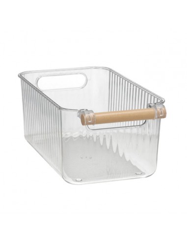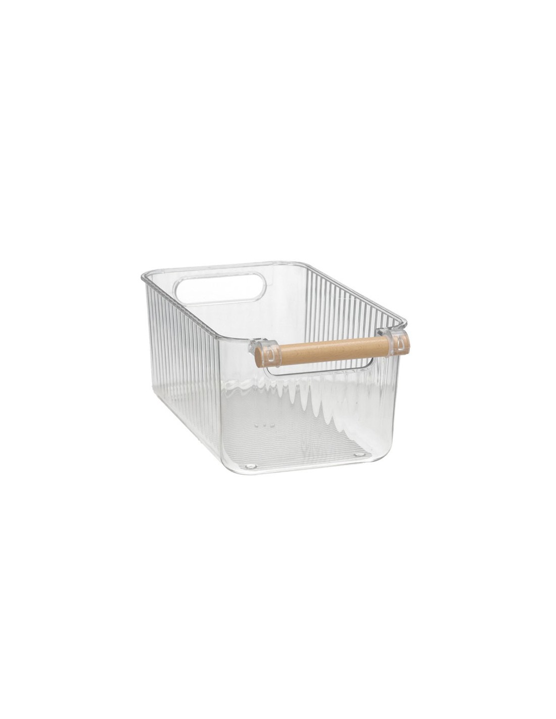 Cesta organizadora de plástico transparente con acabado estriado y asa frontal de madera que añade un toque natural y decorativo.