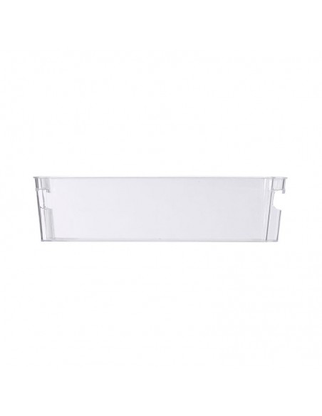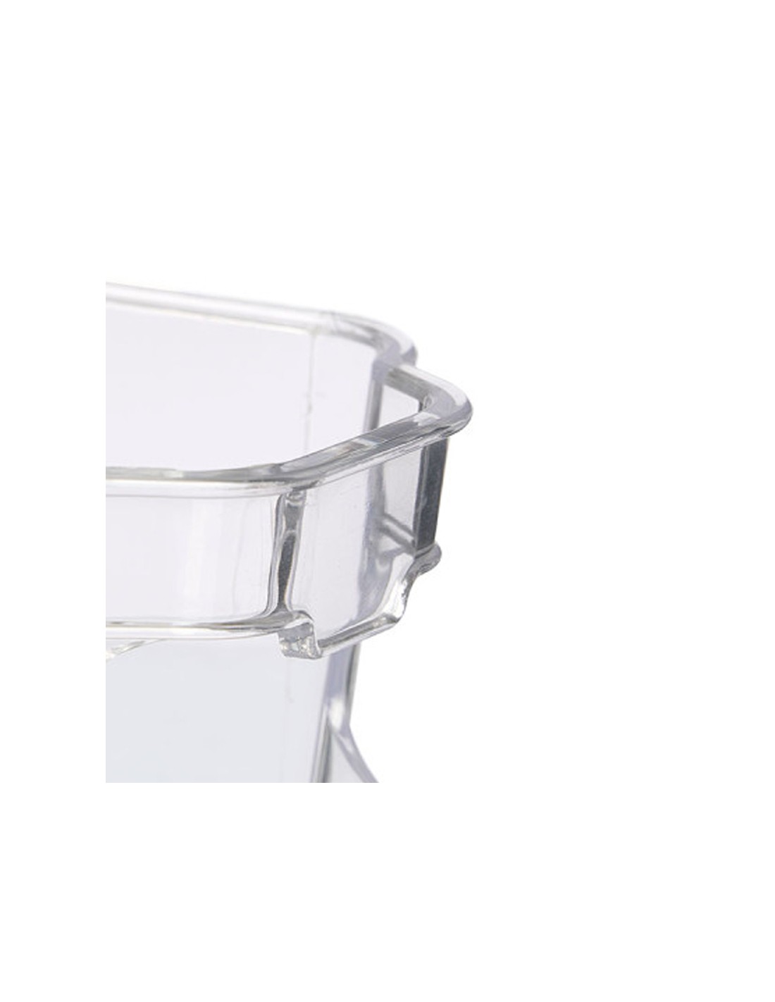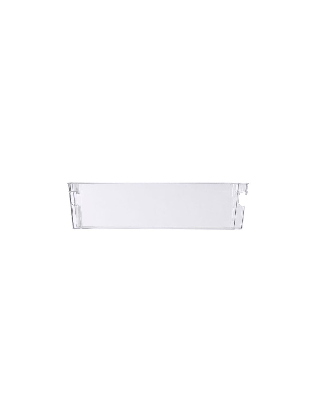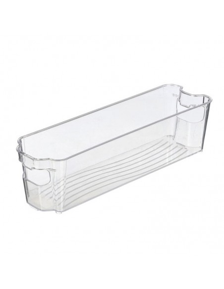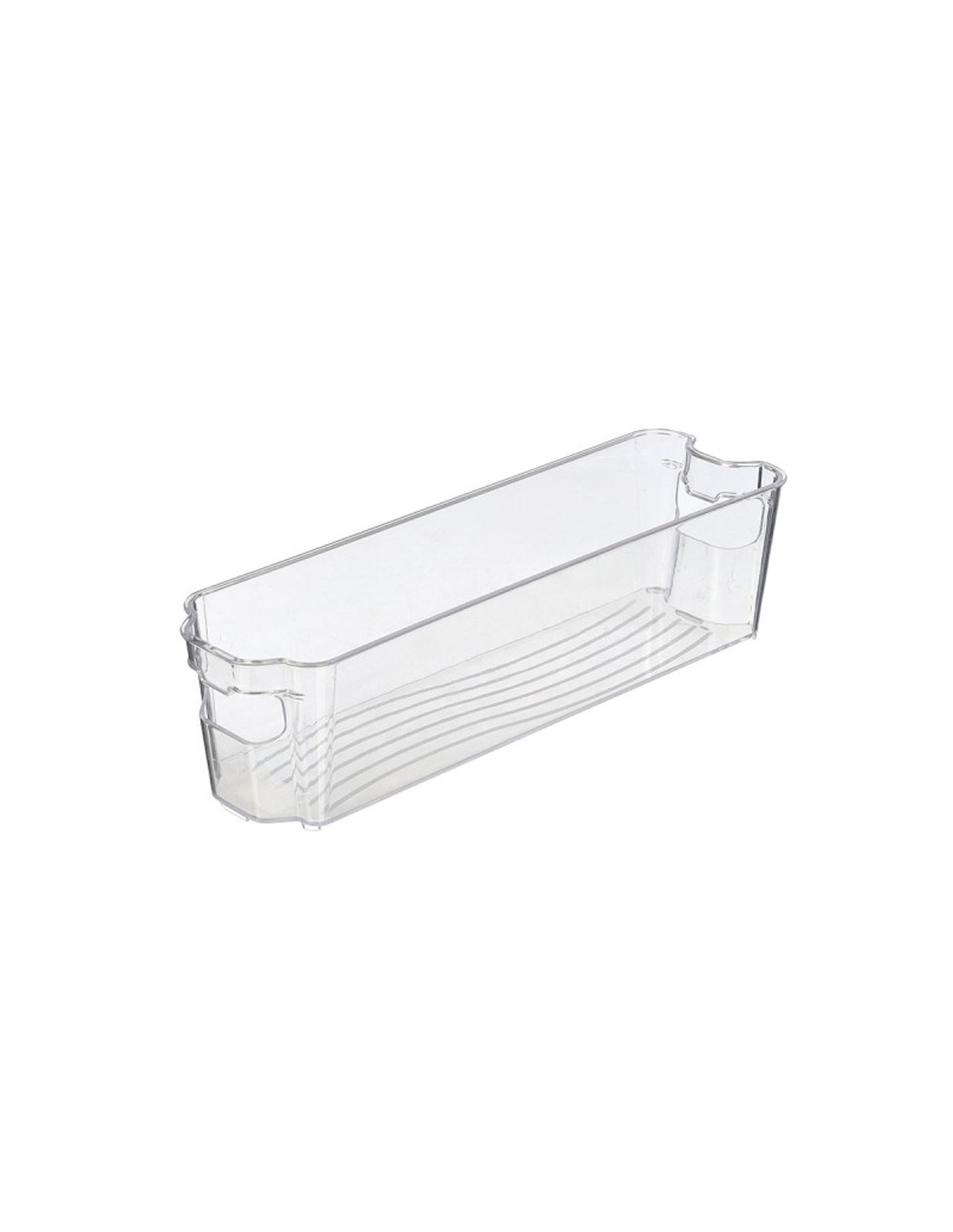 Funcional caja organizadora de plástico transparente con diseño alargado y asas laterales integradas para facilitar su transporte.