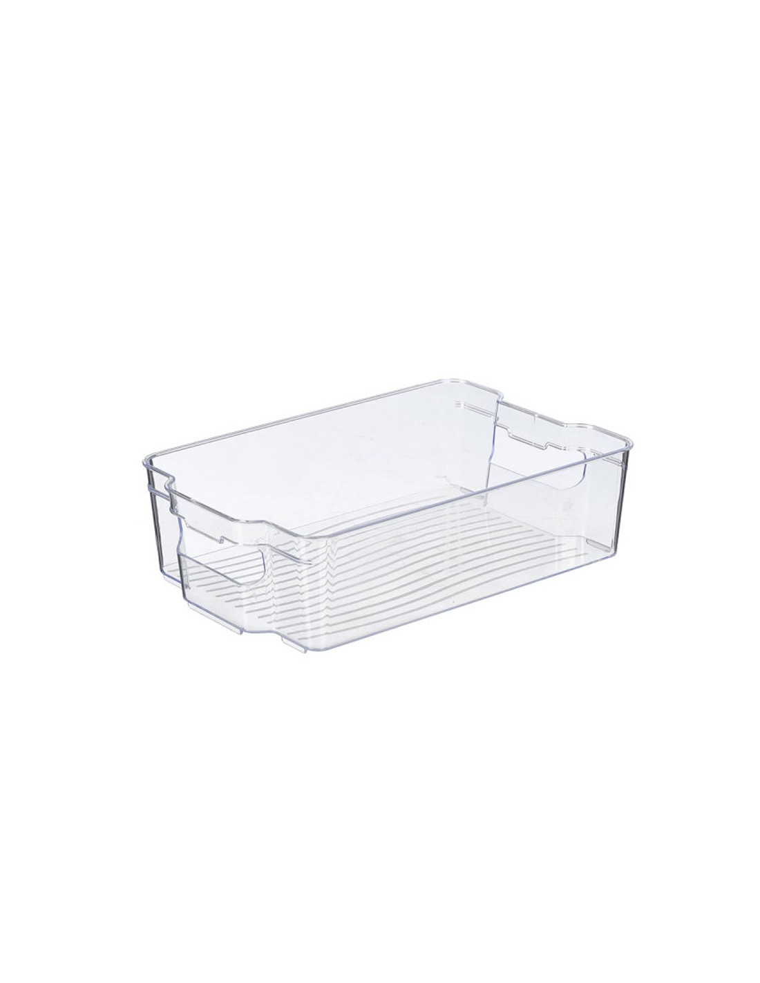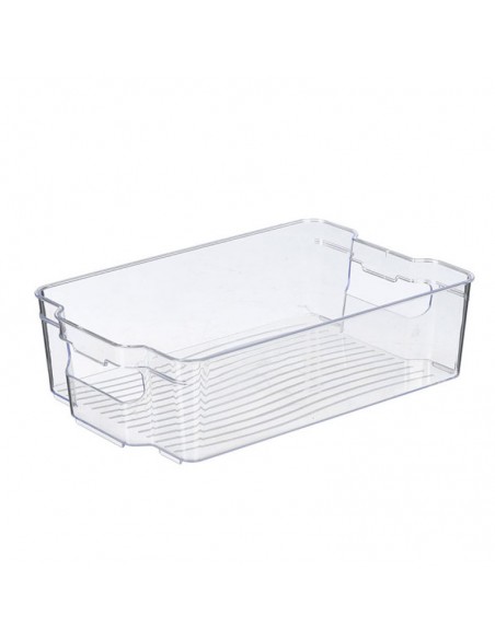 Práctica caja organizadora de plástico transparente con diseño rectangular y asas laterales que facilitan su manejo.