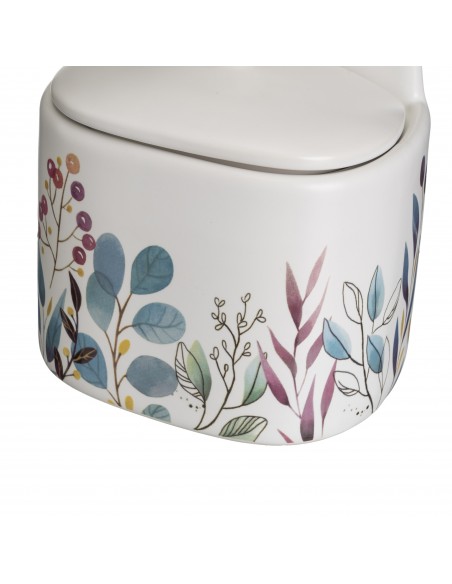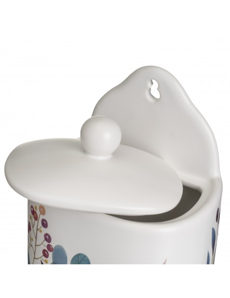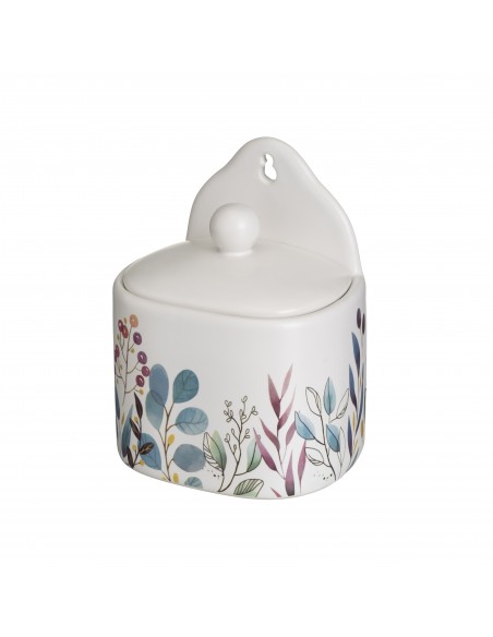 Salero de ceramica color blanco con un diseño de flores silvestre muy bonito y su tapa del mismo material, su parte trasera es alta con un agujero para colgarlo en la pared.