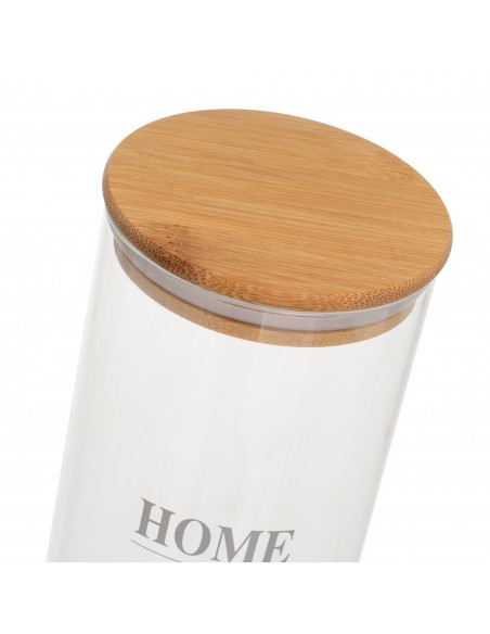 Práctico bote de cocina fabricado en cristal de borosilicato, con tapa de bambú y cierre de silicona que garantiza un buen sellado.