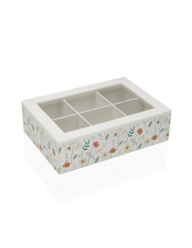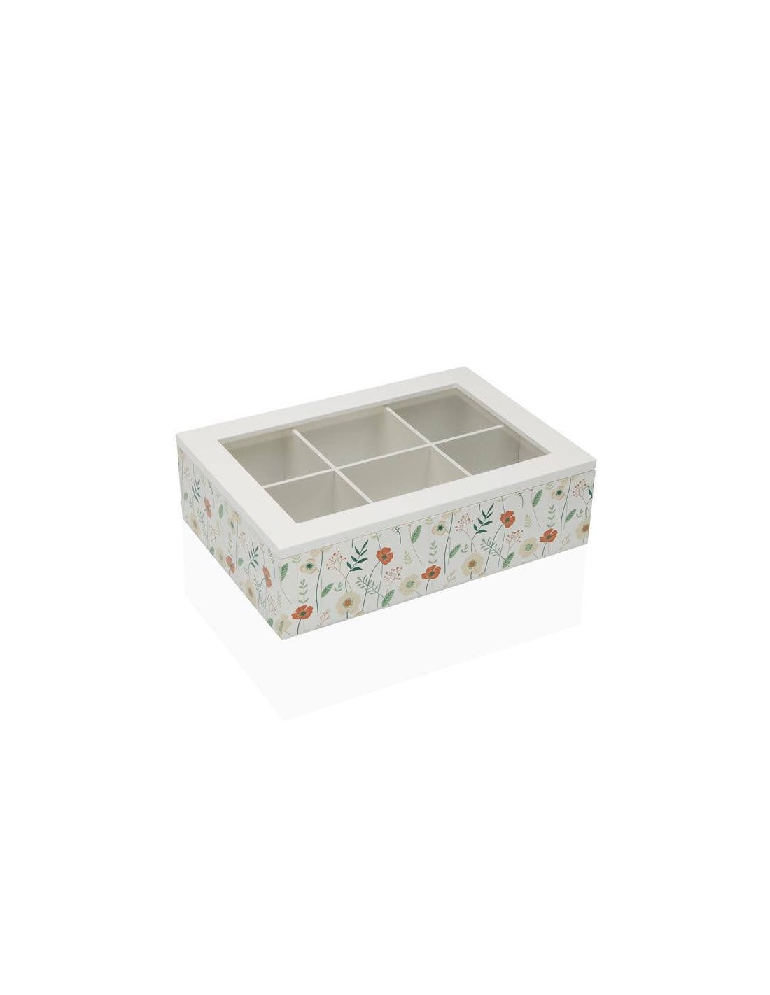 Bonita caja de madera en tono blanco con seis compartimentos interiores y tapa de cristal transparente.