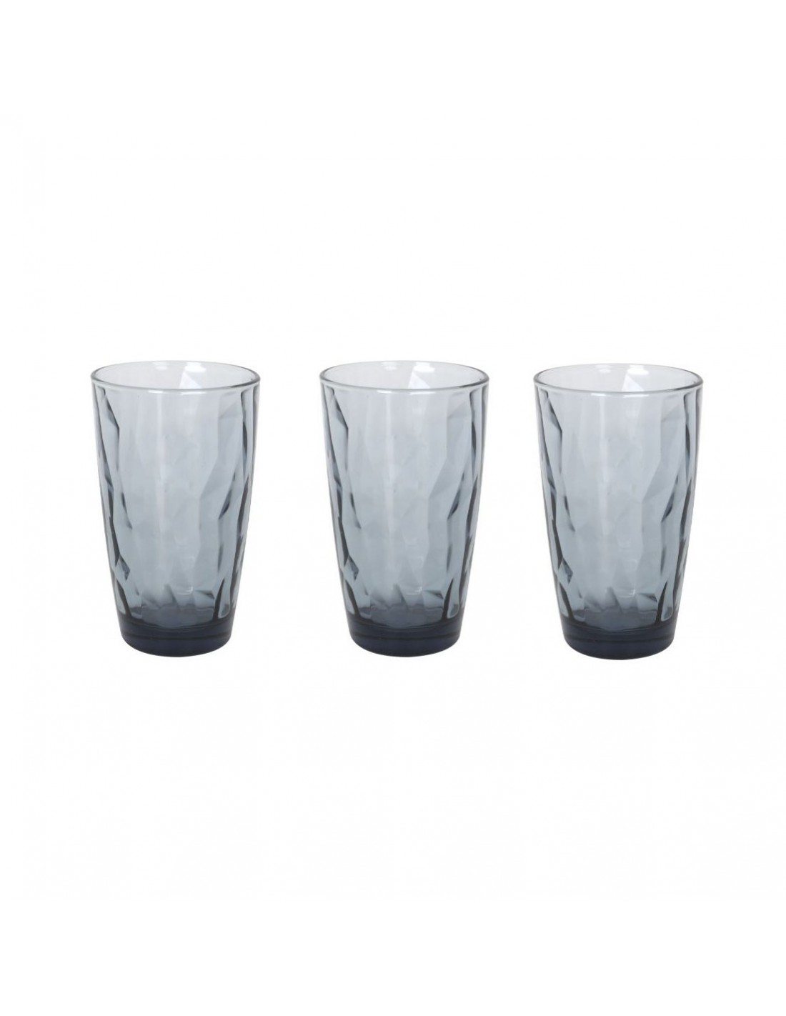 Set de 3 vasos de vidrio en tono azul ahumado con relieve tipo diamante, que aporta brillo y textura a la mesa.