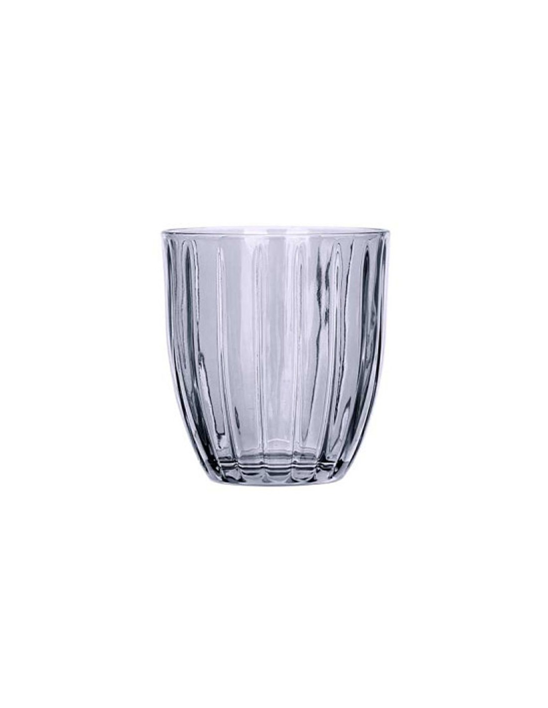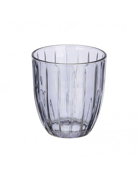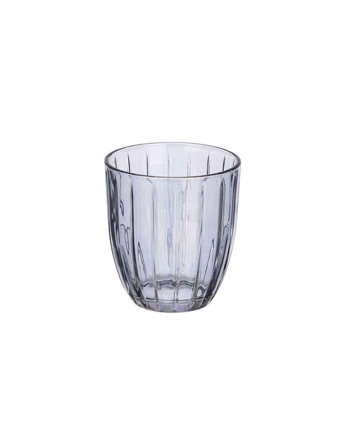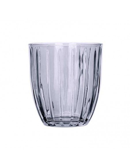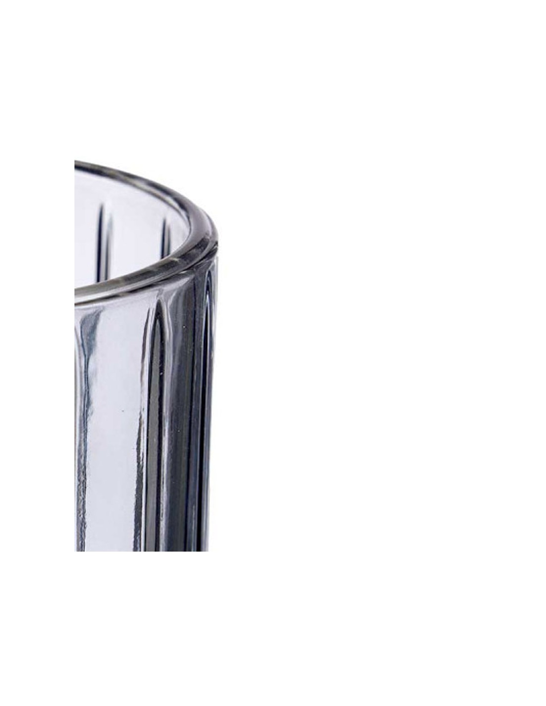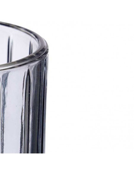 Elegante vaso de cristal azul grisaceo con diseño de rayas vertical que aporta textura y un aire retro a la mesa.