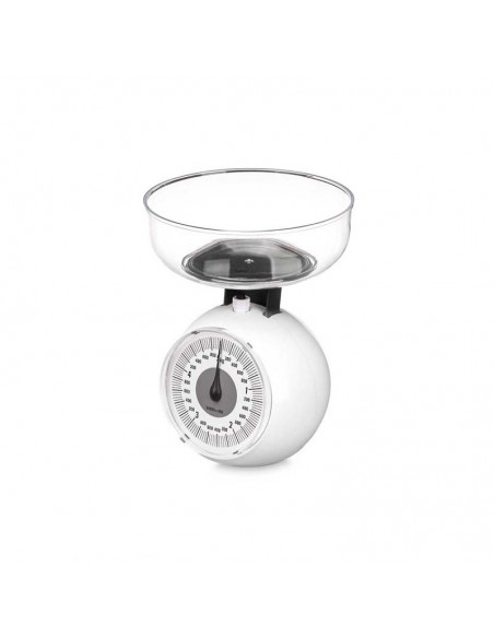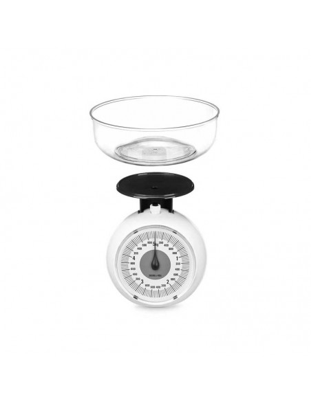 Práctica báscula de cocina en color blanco con cuenco transparente extraíble.