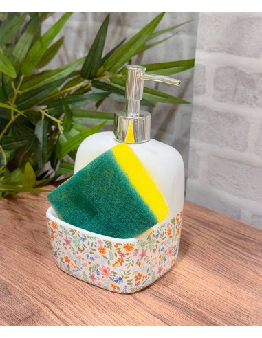 Original dispensador de jabón de dolomita blanca con detalle floral multicolor. Incluye un compartimento delantero pensado para guardar el estropajo y tenerlo siempre a mano (incluido).