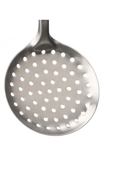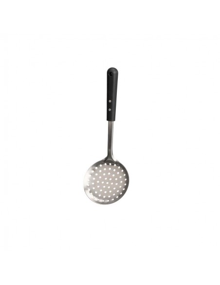Práctica espumadera de acero inoxidable con superficie perforada, perfecta para escurrir frituras o recoger alimentos cocidos con comodidad.
