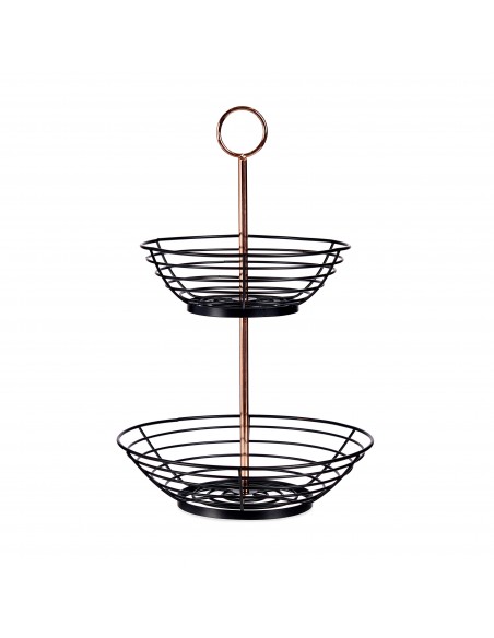Original frutero de metal negro con dos cuencos en diferentes tamaños a dos alturas diferentes unidos por una barra central en color rosa oro.