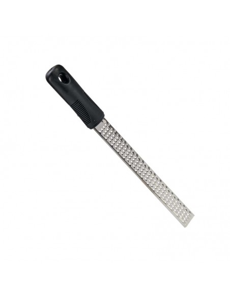 Práctico rallador alargado con mango negro ergonómico que ofrece un agarre cómodo y seguro. No apto para lavavajillas.