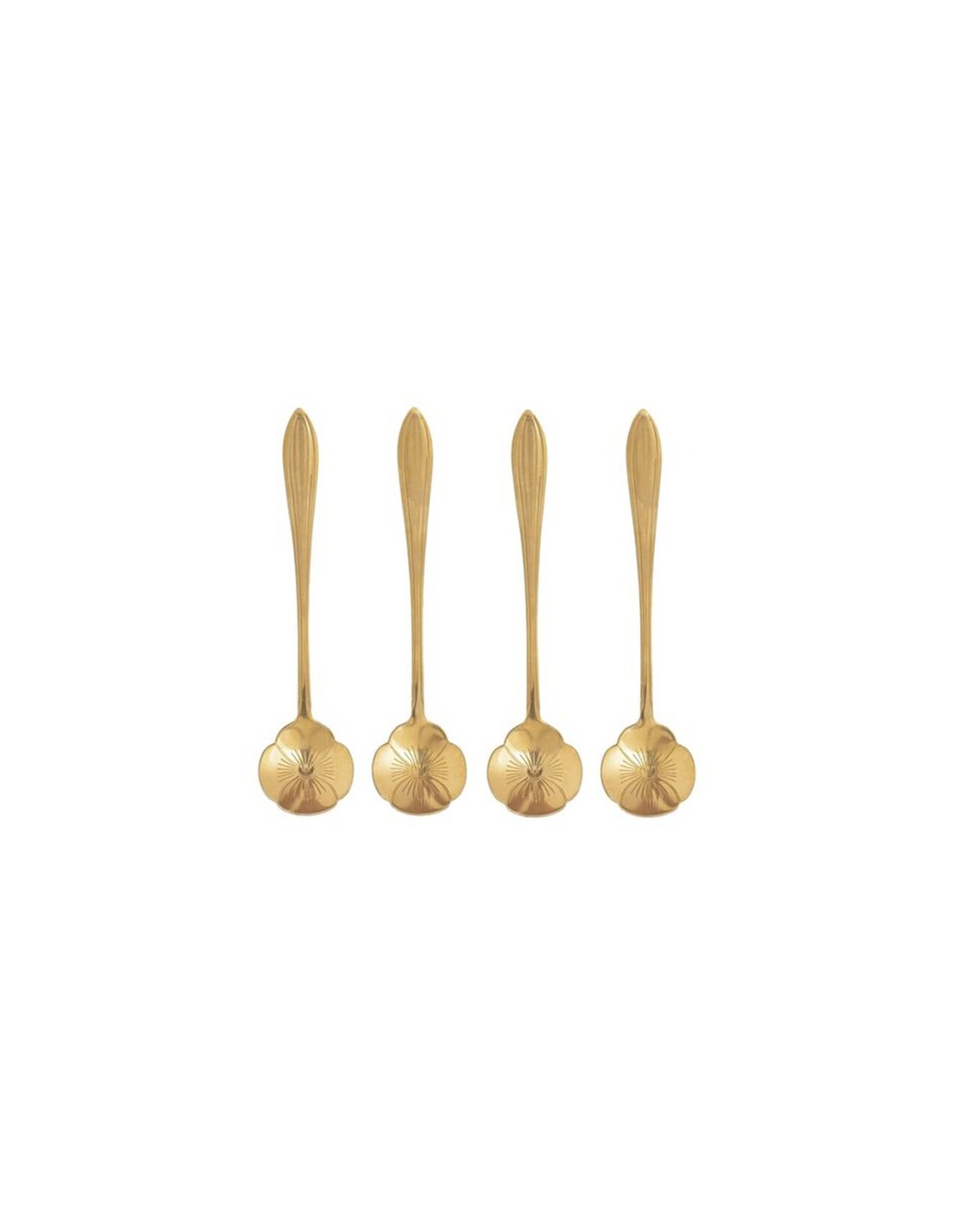 Elegante set de cuatro cucharitas de acero inoxidable con forma de flor en el extremo y acabado dorado, perfectas para dar un toque sofisticado y original a tus momentos de café o té.