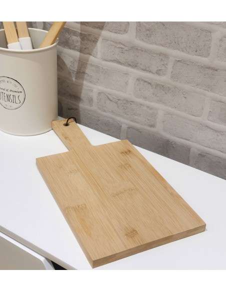 Esta funcional tabla de cortar de bambú es una opción práctica y ecológica para tu cocina. Su diseño sencillo y funcional incluye un mango con cuerda para un fácil almacenamiento y transporte.