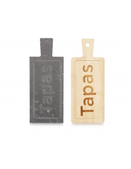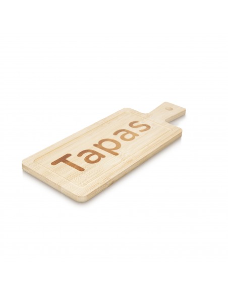 Tabla rectangular con mango y con la palabra tapas grabada en el centro.