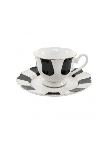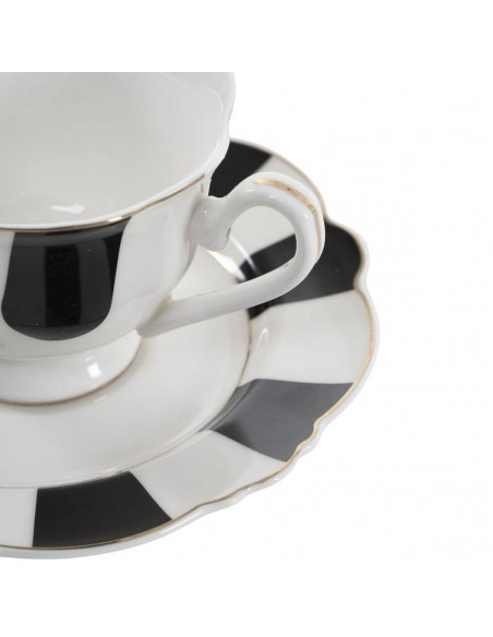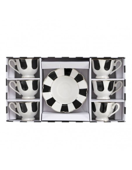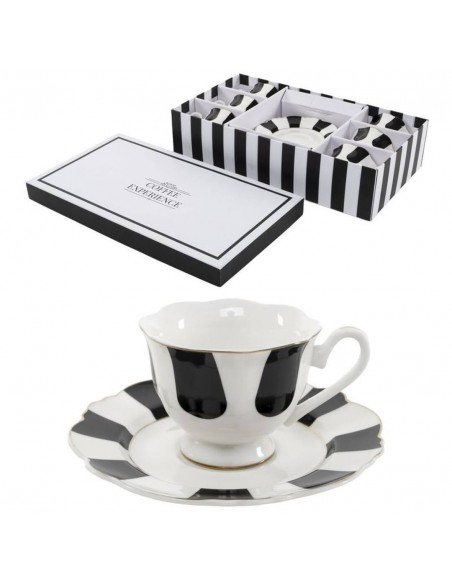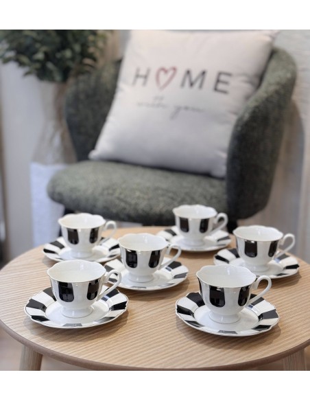 Set de seis tazas de café con sus respectivos platos, diseñadas con un encantador estampado de rayas verticales que les aporta un estilo moderno y original.