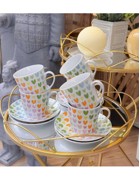Juego de 6 tazas con plato decorados con corazones de colores, perfecto para disfrutar del café o té con un toque alegre y encantador.