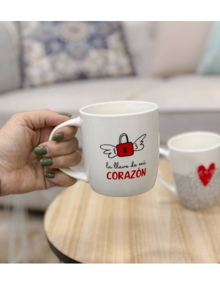 Su diseño es precioso, con el fondo liso de color blanco y presenta la frase "la llave de mi corazón" en negro y rojo con un candado con alas.
